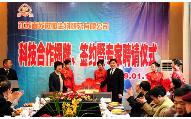 2009年1月16日,江蘇省蘇微微生物研究有限公司隆重舉行科技合作揭牌、簽約暨專家聘請儀式。
