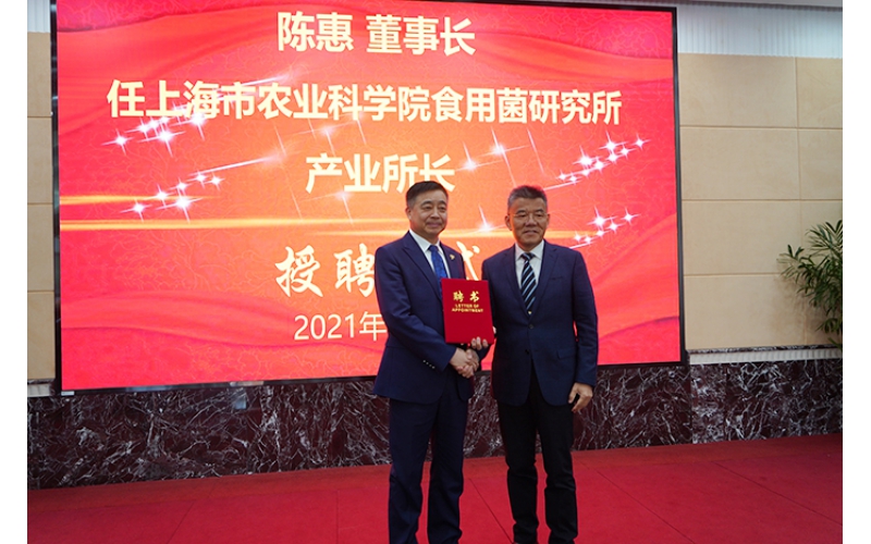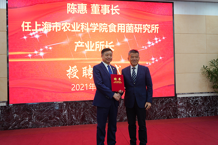 2021年3月22日,上海市農(nóng)業(yè)科學(xué)院食用菌研究所與江蘇安惠生物科技有限公司共同成立“聯(lián)合科技創(chuàng)新中心”舉行揭牌儀式。會(huì)上,安惠公司董事長(zhǎng)陳惠受聘該院食用菌研究所產(chǎn)業(yè)所長(zhǎng)。