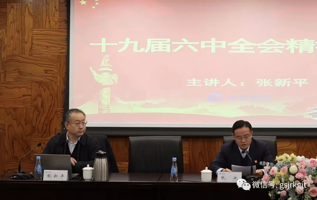 為深入學習貫徹黨的十九屆六中全會精神, 11月30日上午,甘肅金控集團邀請?zhí)m州大學馬克思主義學院張新平教授,舉辦十九屆六中全會精神專題輔導講座。集團黨委書記、董事長祁建邦及在家班子成員參加講座。集團黨委副書記、工會主席張斌主持并講話。