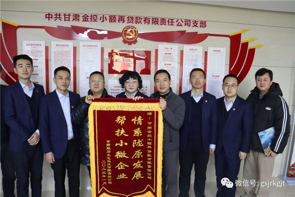 近日,甘肅勝巖生態科技有限責任公司將一面印有“情系隴原發展,幫扶小微企業”的錦旗送到甘肅金控再貸款公司,對金控再貸款公司克服疫情影響,提供優質、高效、貼心的金融服務表示感謝。
