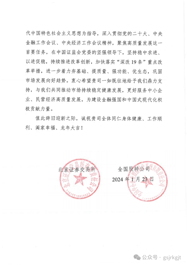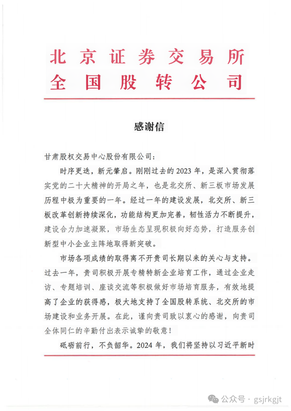 新春到來之際,甘肅股權(quán)交易中心喜獲北交所、全國股轉(zhuǎn)公司發(fā)來的感謝信。2023年,是甘肅股權(quán)交易中心與北交所、全國股轉(zhuǎn)公司深化合作的一年,“北交所、全國股轉(zhuǎn)系統(tǒng)甘肅服務(wù)基地”揭牌、與全國股轉(zhuǎn)公司簽訂《監(jiān)管合作備忘錄》啟動新三板掛牌“綠色通道”便利機制,聯(lián)合開展北交所“三服務(wù)”甘肅行活動,走訪、座談、一對一診斷、培訓(xùn)企業(yè)百余家,基本實現(xiàn)省內(nèi)市州及蘭州新區(qū)全覆蓋,北交所改革東風吹向隴原大地,為甘肅資本市場高質(zhì)量發(fā)展帶來了新的歷史機遇。