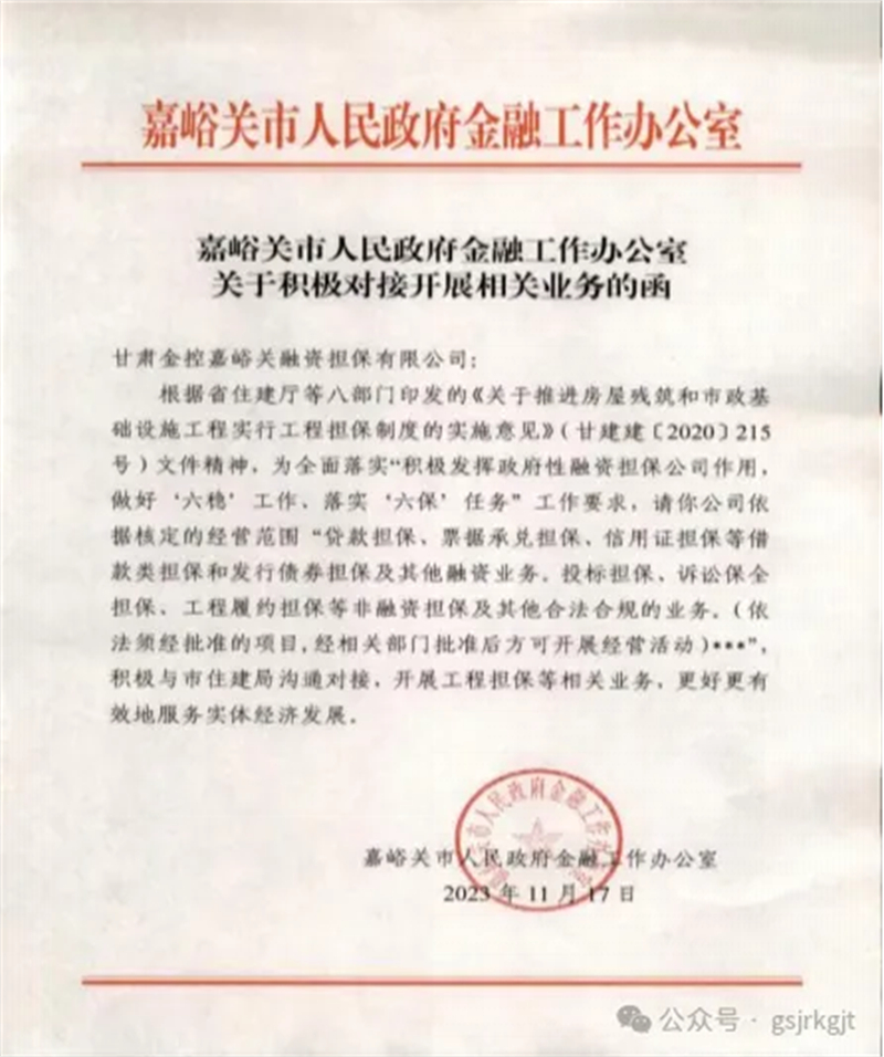 金控嘉峪關(guān)擔(dān)保公司通過開展履約保函等工程擔(dān)保業(yè)務(wù),在助力強(qiáng)化建筑領(lǐng)域風(fēng)險(xiǎn)管理和建立健全建筑市場誠信機(jī)制中充分發(fā)揮政府性融資擔(dān)保機(jī)構(gòu)職能,為更好服務(wù)地方實(shí)體經(jīng)濟(jì)發(fā)展努力貢獻(xiàn)自身力量。